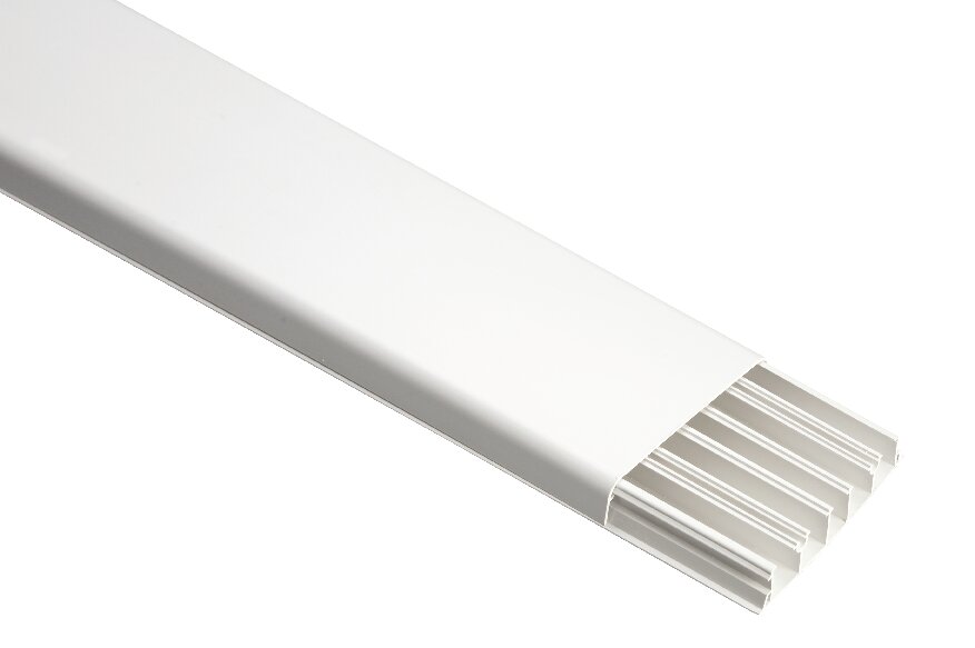 Canale a battiscopa e cornice prodotto in tecnopolimero a base di PVC autoestinguente. Fondo preforato per installazione faciliata. 5 scomparti interni simmetrici. Coperchio avvolgente smontabile solo con attrezzo. Coperchio fornito ricoperto con pellicola protettiva trasparente. Il primo scomparto a pavimento è utilizzabile solo per circuiti di telecomunicazione.