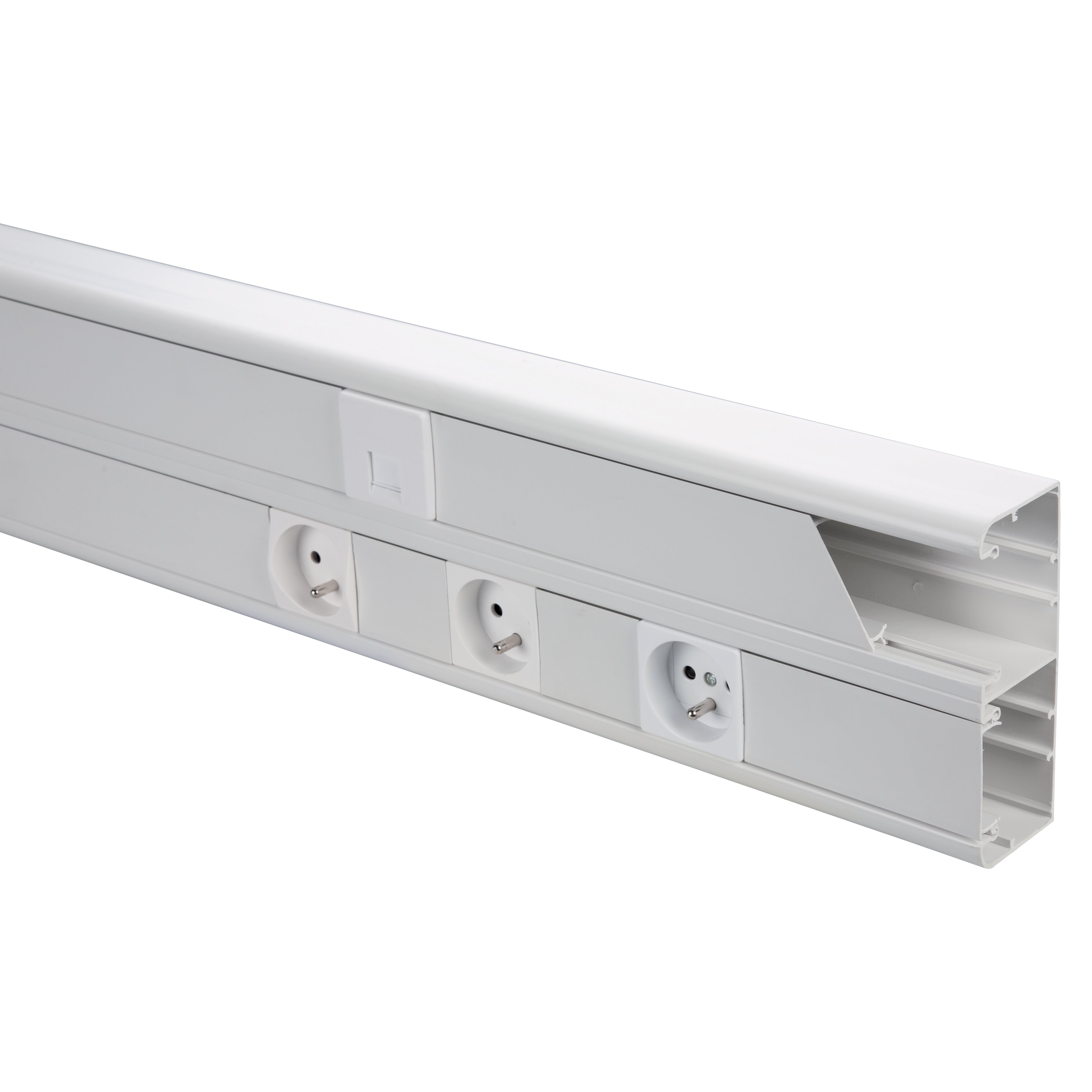 Canale portacavi e portapparecchi prodotto in tecnopolimero a base di PVC rigido autoestinguente. Per apparecchi standard 45×45 mm con fissaggio diretto al canale. Preforatura del fondo per fissaggio con viti e tasselli. Coperchio ad aggancio frontale fornito. Canale e coperchio fornito ricoperto con pellicola protettiva trasparente.