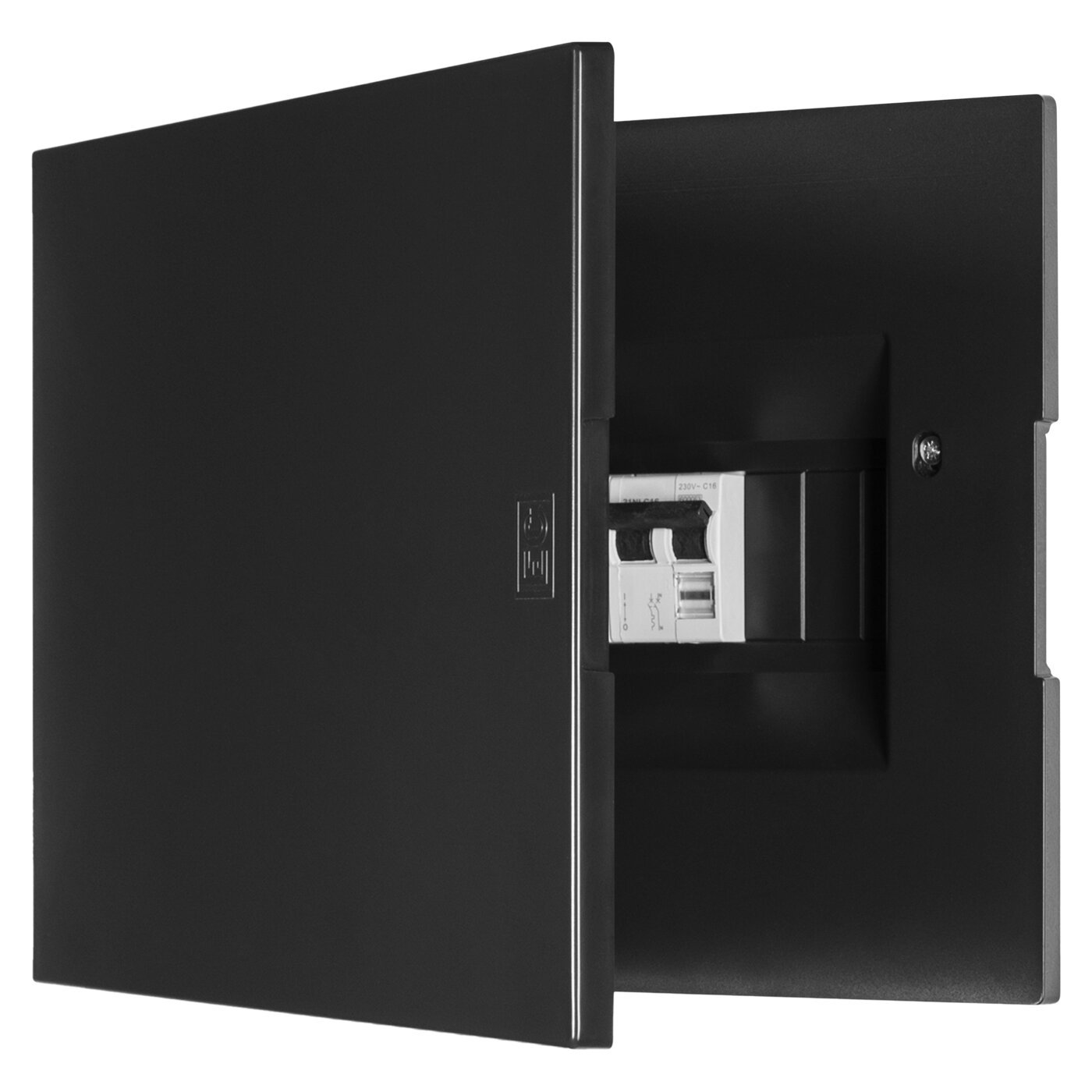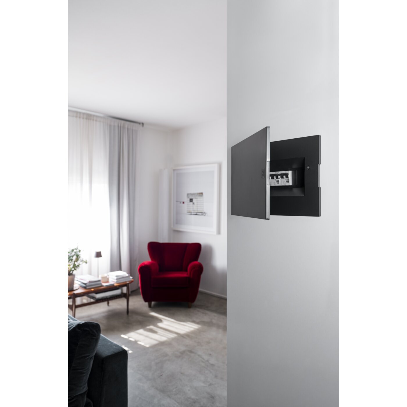 Fronte centralino da incasso per pareti in muratura o cartongesso. Resistenza al calore anomalo fino a 650° C (GWT). Coperchio e portello in tecnopolimero halogen free a base di ABS. Coperchio reversibile. Etichetta autoadesiva di identificazione circuiti in dotazione. Tappo di copertura per moduli non utilizzati in dotazione. Guida DIN in acciaio zincato montata su supporto estraibile per un perfetto allineamento orizzontale. Prodotto in conformità alla norma EN 60670-1:2005, EN 60670-22:2013. Temperature durante l’installazione: minima –15°C, massima +60°C. Grado di protezione IP40.