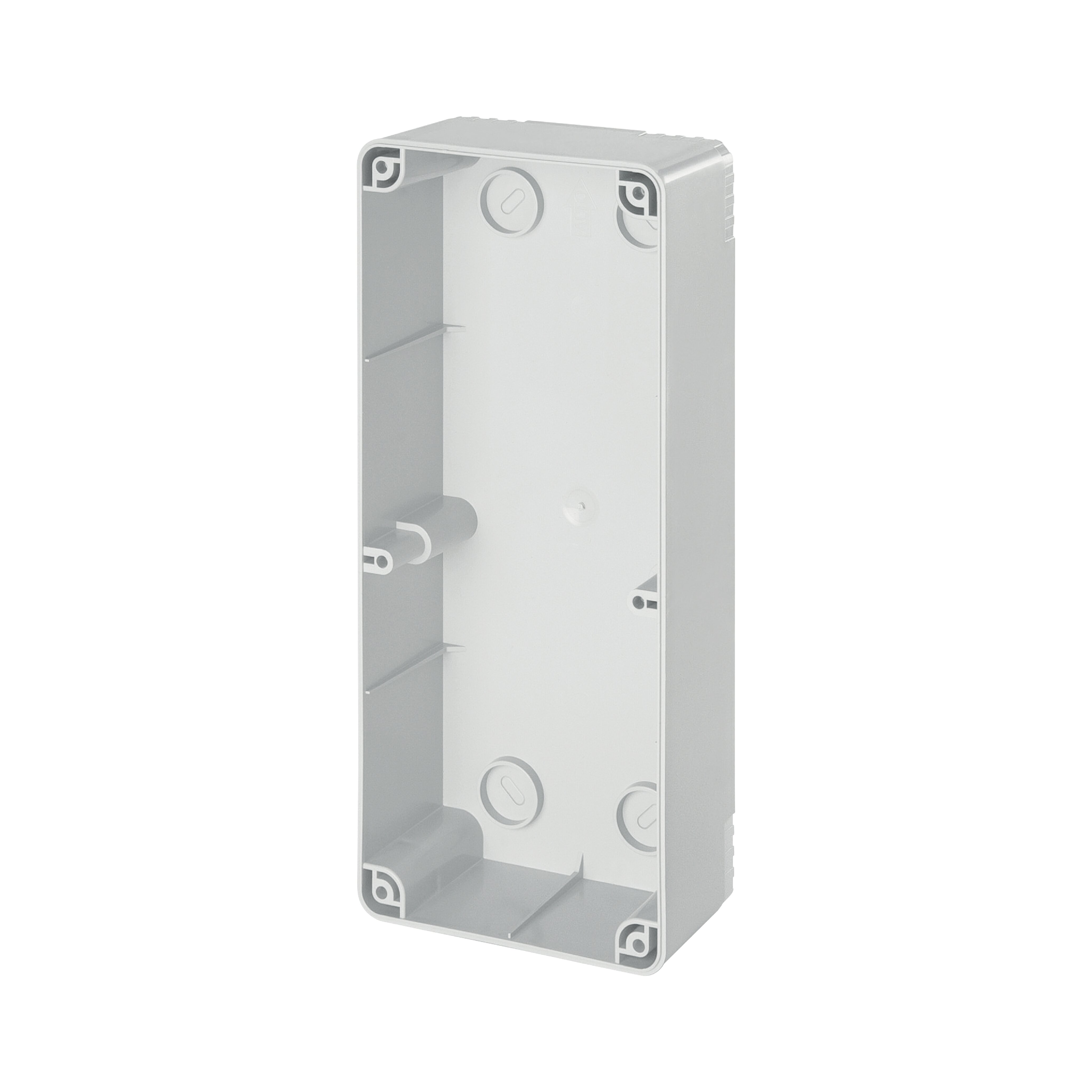 Fondo da parete per prese interbloccate verticali con/senza base fusibili. Dimensioni 120x280x67 mm. Prodotto in tecnopolimero antiurto a base di ABS. resistenza al calore anomalo: 650°C (GWT). Possibilità di realizzare il doppio isolamento utilizzando i tappi copriviti.