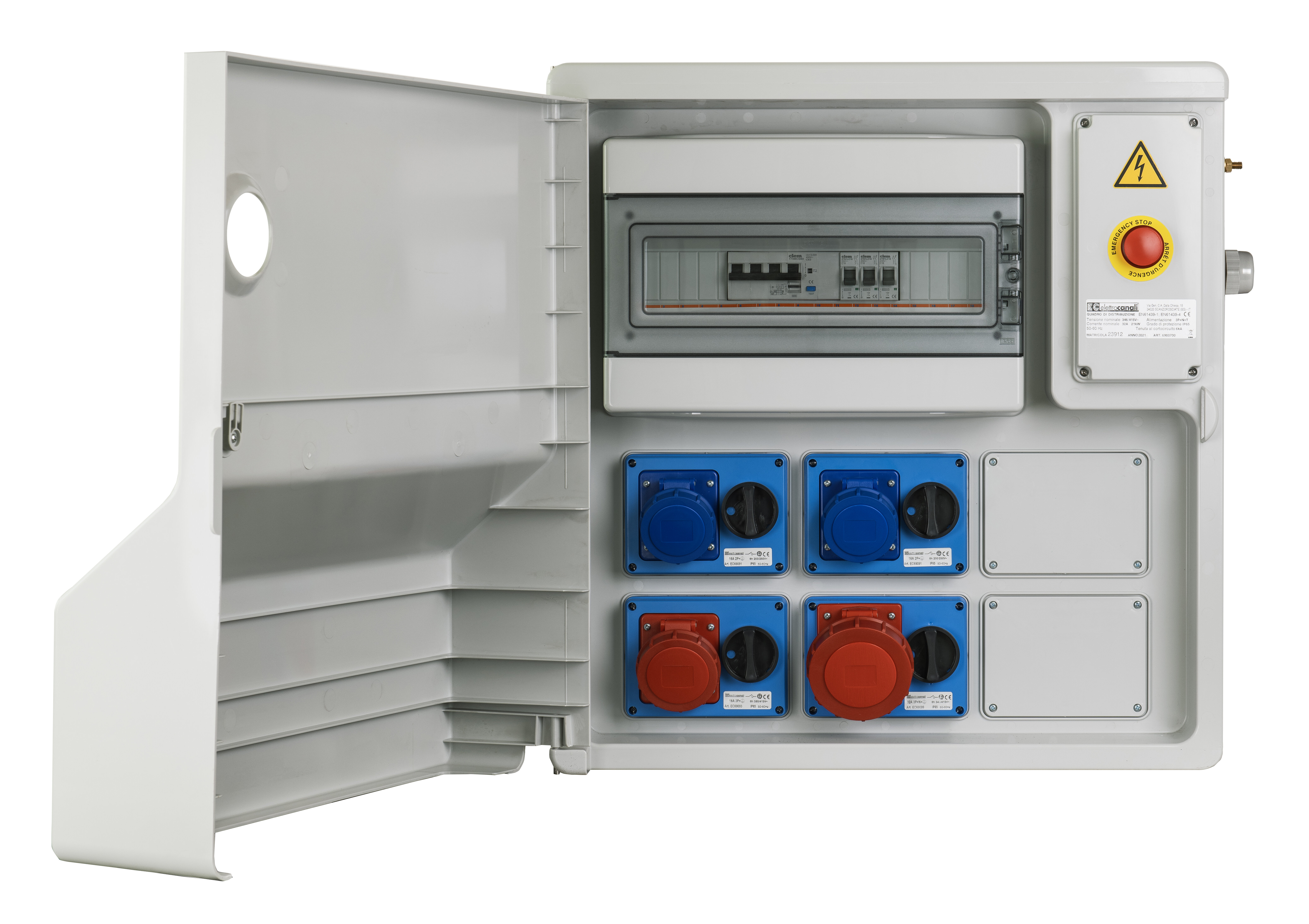 Quadro di distribuzione assemblato in serie tipo ASC. Realizzato in tecnopolimetro antiurto a base di ABS. Grado di resistenza agli urti IK09, adatto per impieghi gravosi. Guida DIN in acciaio zincato. Chiusura porta con chiave triangolare in dotazione. Serratura di sicurezza disponibile per la porta esterna. Protezioni magnetotermiche delle uscite in centralino equipaggiabile con serratura di sicurezza. Possibilità di fissaggio a parete con staffe incluse o su cavalletto metallico. Maniglie di trasporto integrate nella scocca. Base aperta per uscita cavi di collegamento. Funzionamento con spine inserite anche a porta chiusa. Angolo di apertura porta pari a 157°. Prodotto in conformità alle norme EN60670-1, EN 60670-24, EN 61439-1, EN 61439-4.