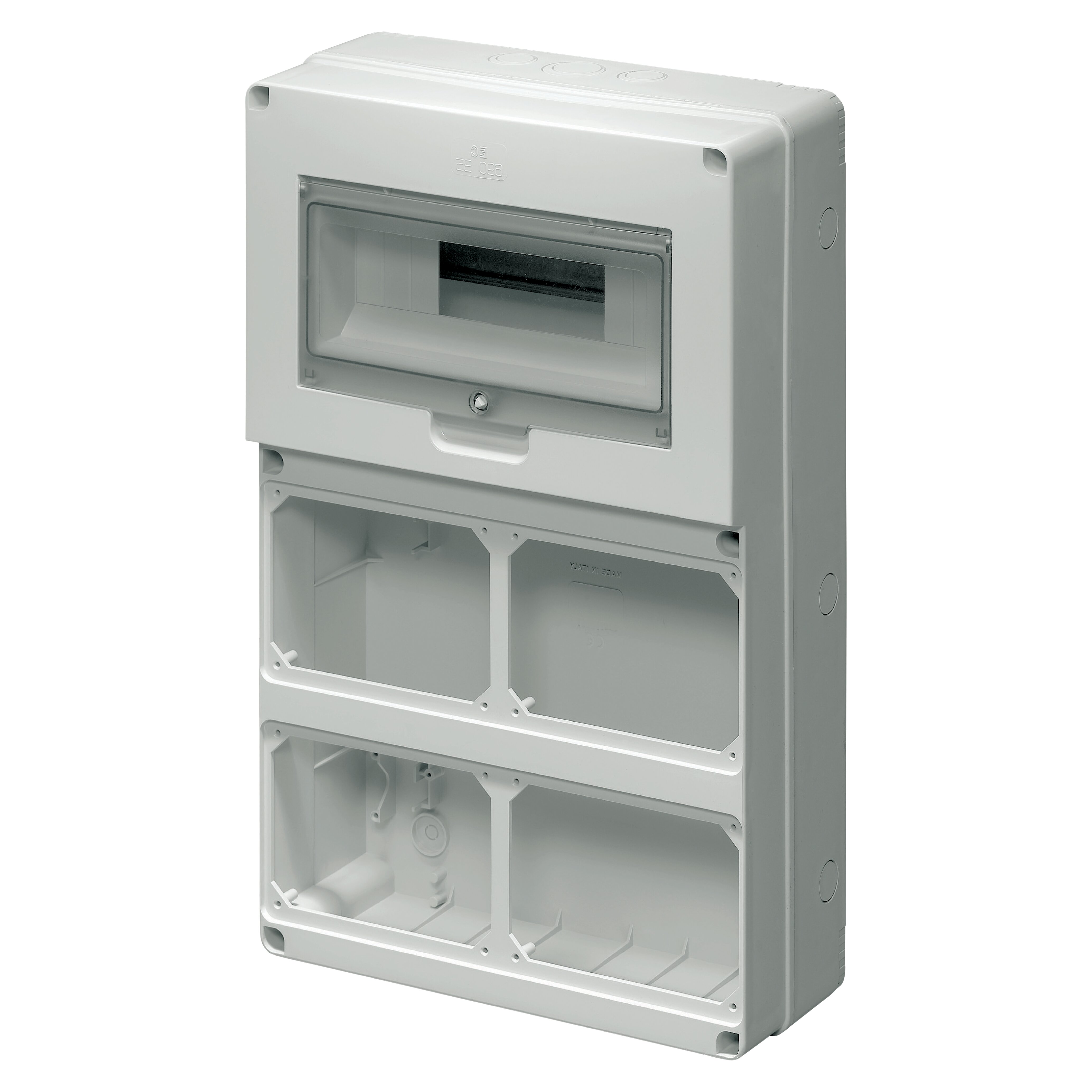 Quadro di distribuzione per installazione di apparecchi modulari e prese industriali. Realizzato in tecnopolimetro antiurto a base di ABS. Guida DIN in acciaio zincato montata sul fondo e regolabile in profondità. Pretranciature per ingresso tubi o cavi con passacavi, raccordi tubo o pressacavi di diverse dimensioni. Fornito di serie completo di tappi copriviti per realizzare il doppio isolamento. Coperchio incernierato. Chiusura portello con chiave triangolare in dotazione. Flange cieche in dotazione. Prodotto in conformità alle norme EN60670-1, EN 60670-24.