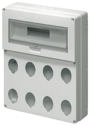 Modello preforato per 8 prese 16/32A. Verificare preventivamente dimensioni e ingombri delle prese da installare. Dimensioni 400x525x135 mm. 19 moduli DIN. Potenza dissipabile 30 W.