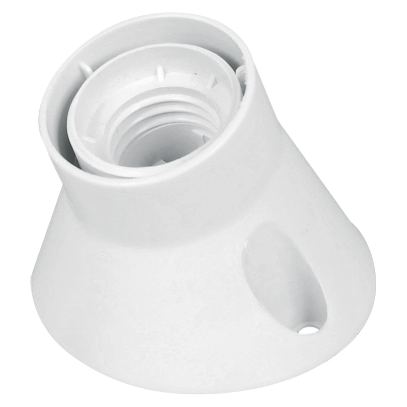Punto luce da parete E27 base inclinata. Corrente Nominale 4A. Realizzato in materiale tecnopolimero termoplastico. Resistenza al calore anomalo (GWT norma IEC 60695-2-11): fino a 650°C. Tensione nominale: 250 V~. Temperatura nominale: T190° C. Grado di protezione: IP20. Inserto in termoplastico con inserti a vite.