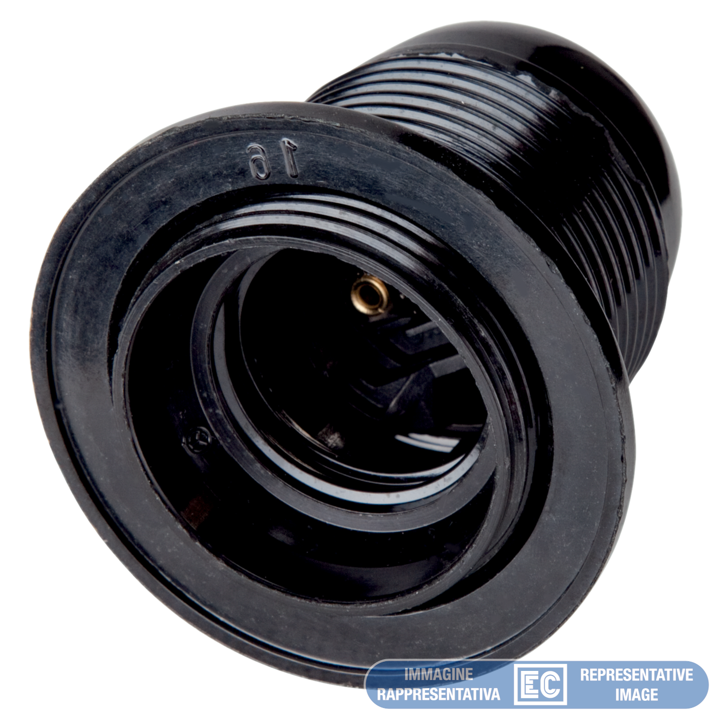 Portalampada E14. Corrente Nominale 2A. Realizzato in materiale tecnopolimero termoplastico. Camicia filettata, con doppia ghiera. Resistenza al calore anomalo (GWT norma IEC 60695-2-11): fino a 650°C. Tensione nominale: 250 V~. Temperatura nominale: T190° C. Grado di protezione: IP20. Inserto in termoplastico con inserti a vite.