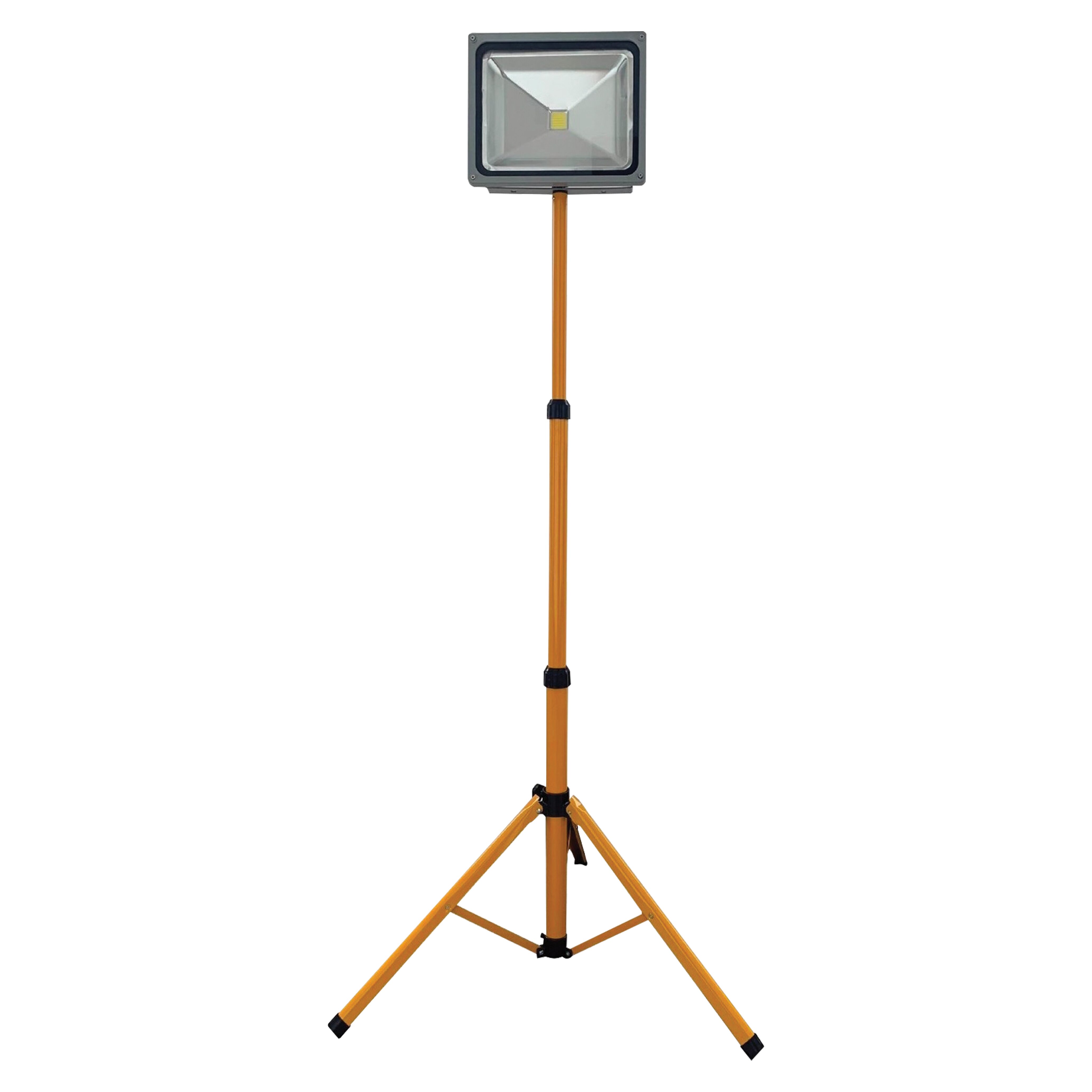 Proiettore a LED realizzato in alluminio pressofuso verniciato nero. Pianta regolabile 950-1800 mm in acciaio verniciato giallo. Riflettore in allumino liscio. Tensione nominale: 240V~. Potenza modulo LED: 50 W. Temperatura di colore: luce fredda. Luminosità: 4500 lm. Spina tipo S31 Schuko. Cavo HO5RNF 3G1 VDE Lunghezza 1,5 mt. Grado di protezione: IP65.
