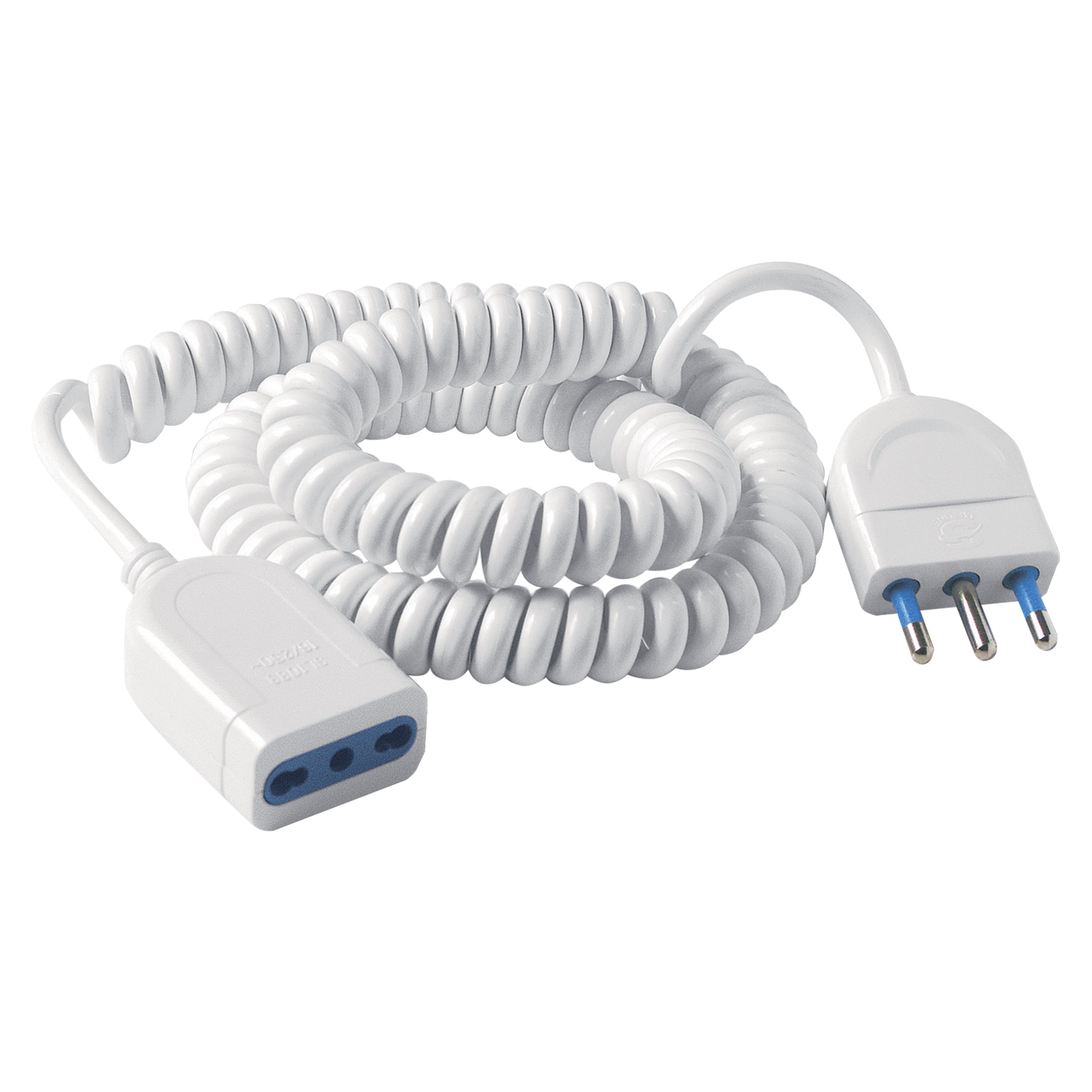 Cavo prolunga spiralata Spina e Presa bivalente 2P+T 16A tipo S17/P17/11. Spina e presa in tecnopolimero autoestinguente V0 (Norma UL94) ad elevata resistenza ai raggi UV. Colore Bianco. Presa con alveoli protetti da contatti accidentali. Spina indissolubilmente legata al cavo con spinotti in ottone nichelato protetti. Cavo H05VV-F 3G0.1 – doppio isolamento – VDE. Lunghezza 3 mt. Tensione nominale: 250 V~ 50Hz. Potenza massima 1500W. Resistenza al calore anomalo (GWT norma IEC 6069532-11): fino a 750°C. Grado di protezione: IP20. Temperatura d’impiego: -15°C +35°C.