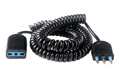 Cavo prolunga spiralata Spina e Presa bivalente 2P+T 16A tipo S17/P17/11. Spina e presa in tecnopolimero autoestinguente V0 (Norma UL94) ad elevata resistenza ai raggi UV. Colore Nero. Presa con alveoli protetti da contatti accidentali. Spina indissolubilmente legata al cavo con spinotti in ottone nichelato protetti. Cavo H05VV-F 3G0.1 – doppio isolamento – VDE. Lunghezza 3 mt. Tensione nominale: 250 V~ 50Hz. Potenza massima 1500W. Resistenza al calore anomalo (GWT norma IEC 6069532-11): fino a 750°C. Grado di protezione: IP20. Temperatura d’impiego: -15°C +35°C.