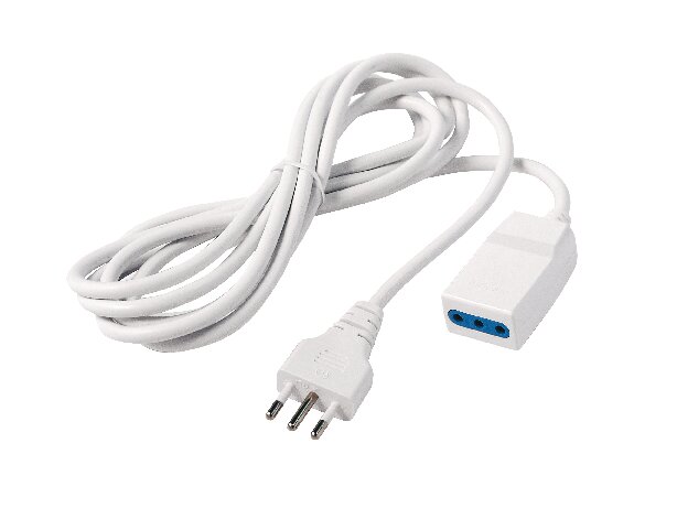 Cavo prolunga Spina e Presa 2P+T 10A tipo S11/P11. Spina e presa in tecnopolimero autoestinguente V0 (Norma UL94) ad elevata resistenza ai raggi UV. Colore Bianco. Presa con alveoli protetti da contatti accidentali. Spina indissolubilmente legata al cavo con spinotti in ottone nichelato protetti. Cavo H05VV-F 3G0.75 – doppio isolamento – VDE. Lunghezza 5 mt. Tensione nominale: 250 V~ 50Hz. Potenza massima 1500W. Resistenza al calore anomalo (GWT norma IEC 6069532-11): fino a 750°C. Grado di protezione: IP20. Temperatura d’impiego: -15°C +35°C.