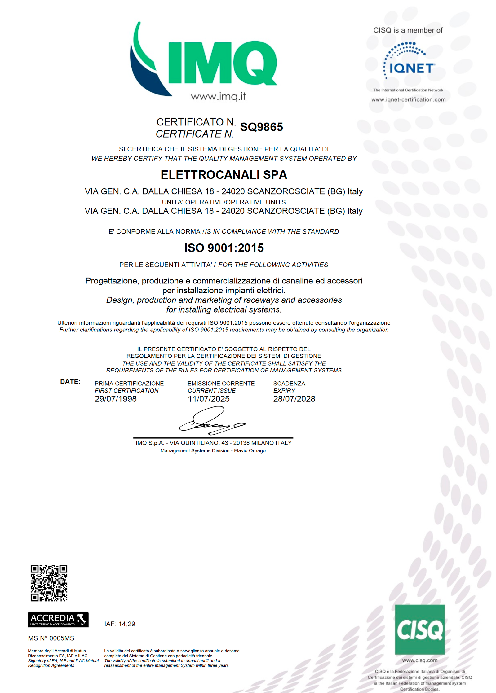 Die Produktion unterliegt der Qualitätssicherung gemäß der Norm ISO9001, für die ELETTROCANALI seit 1998 zertifiziert ist.