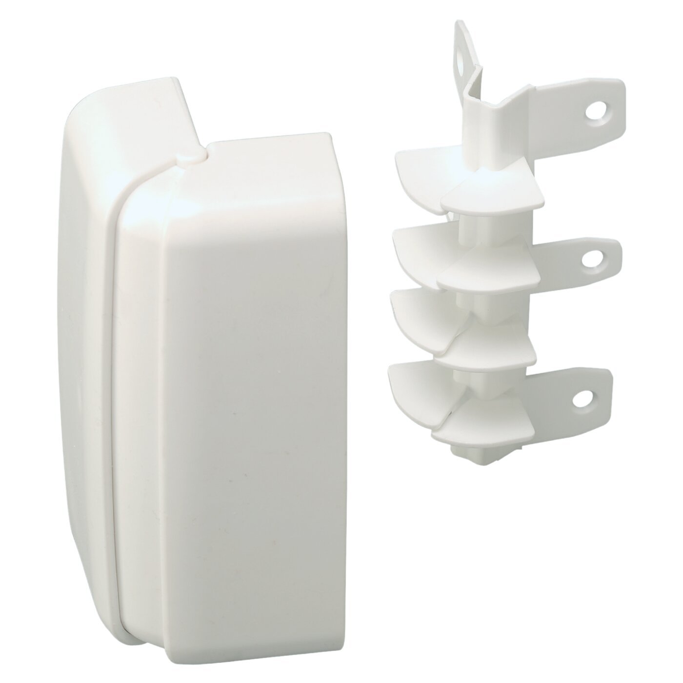 External angle composed of a flexible internal section, quickly attached with screws, which allows for insulation and continuous separation of cables within their compartments. Rigid cover, adjustable from 60° to 120°, snaps on. Designed with rounded lines and no sharp edges to minimize accidental impacts and the possibility of detachment from the trunking.