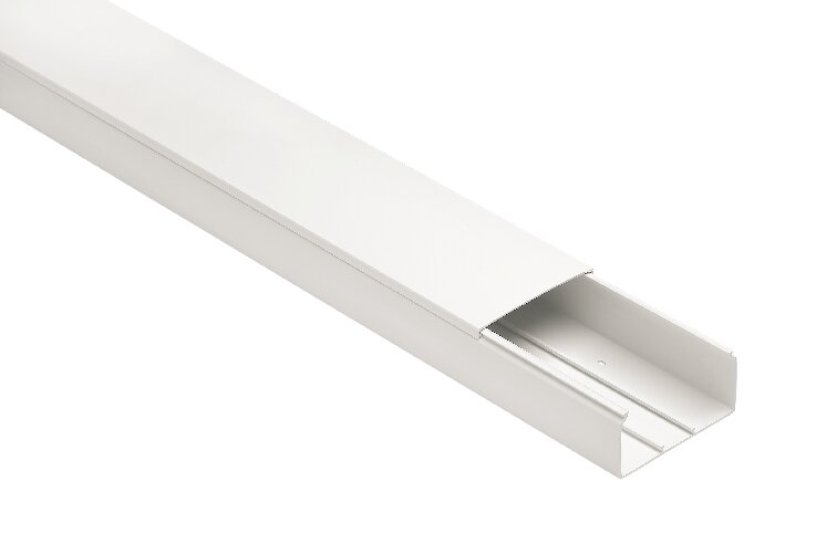 Cable duct made of self-extinguishing rigid PVC technopolymer. The bottom is pre-drilled for fixing with screws and anchors. A front-hinged lid is included.