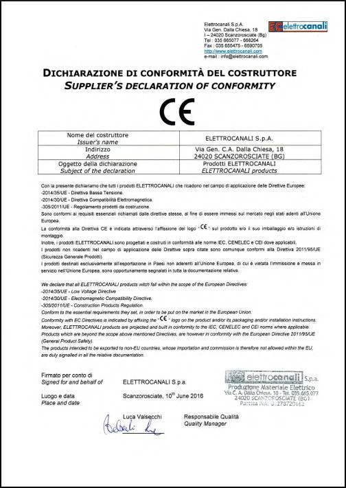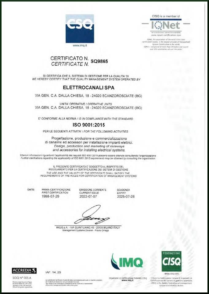 Since 1998 the production has been working in compliance with the Standard ISO 9001, which means ELETTROCANALI: