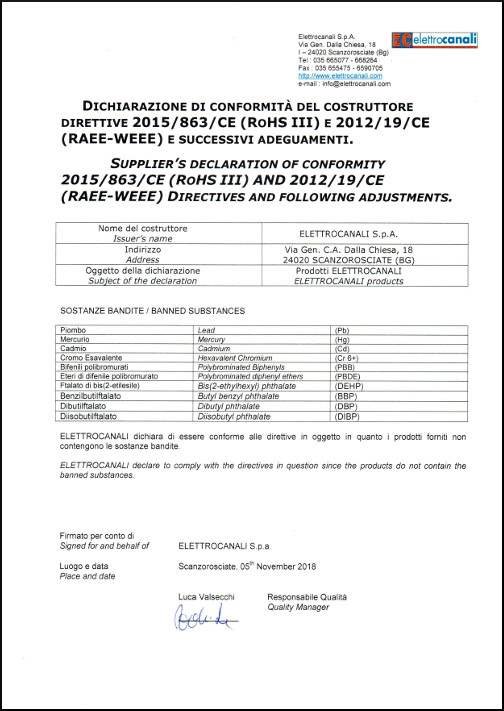 Elettrocanali, which has always paid attention to the environment and to the customers’ needs, supplies products complying with the requirements of the European directive 2015/863/UE, known as RoHS III regulation, aiming to control the use of certain hazardous substances in the production and distribution of new electrical and electronic equipment placed on the European market. The regulation restricts, starting with 1th July 2006, the use of heavy metals and their compounds, like:
