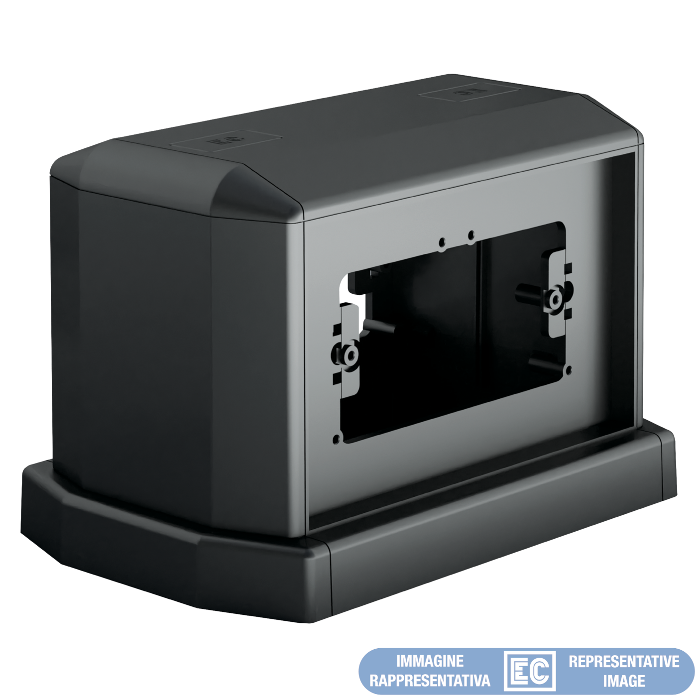 Double-sided tower made of shock-resistant technopolymer. Designed for 4+4 fixtures with 108.5 mm spacing or for 2+2 fixtures with 60 mm spacing. End cap included for single-sided use. Designed for the entry of 75×17 and 50×12 mm floor trunking. Can be installed on poured or raised floors.