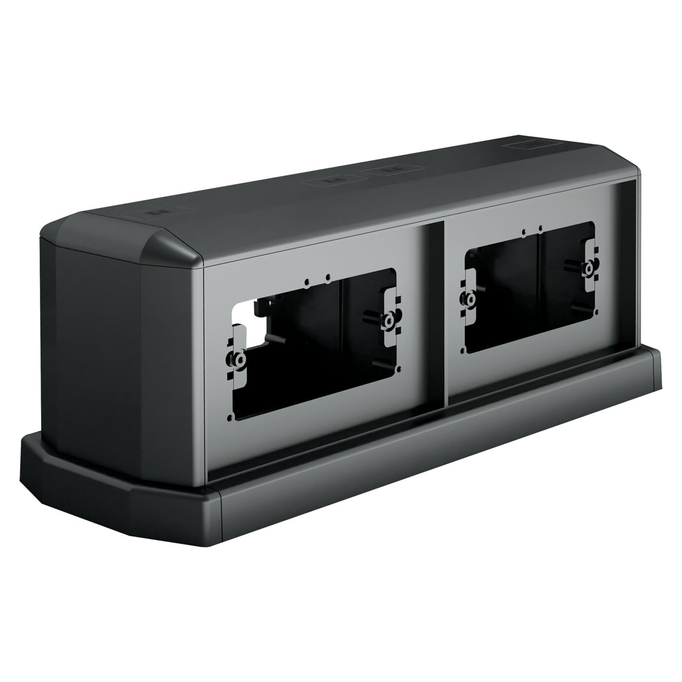 Horizontal expansion for double-sided tower made of shock-resistant technopolymer. Designed for 4+4 fixtures with 108.5 mm spacing or for 2+2 fixtures with 60 mm spacing. End cap included for single-sided use. Designed for the entry of 75×17 and 50×12 mm floor trunking. Can be installed on poured or raised floors.