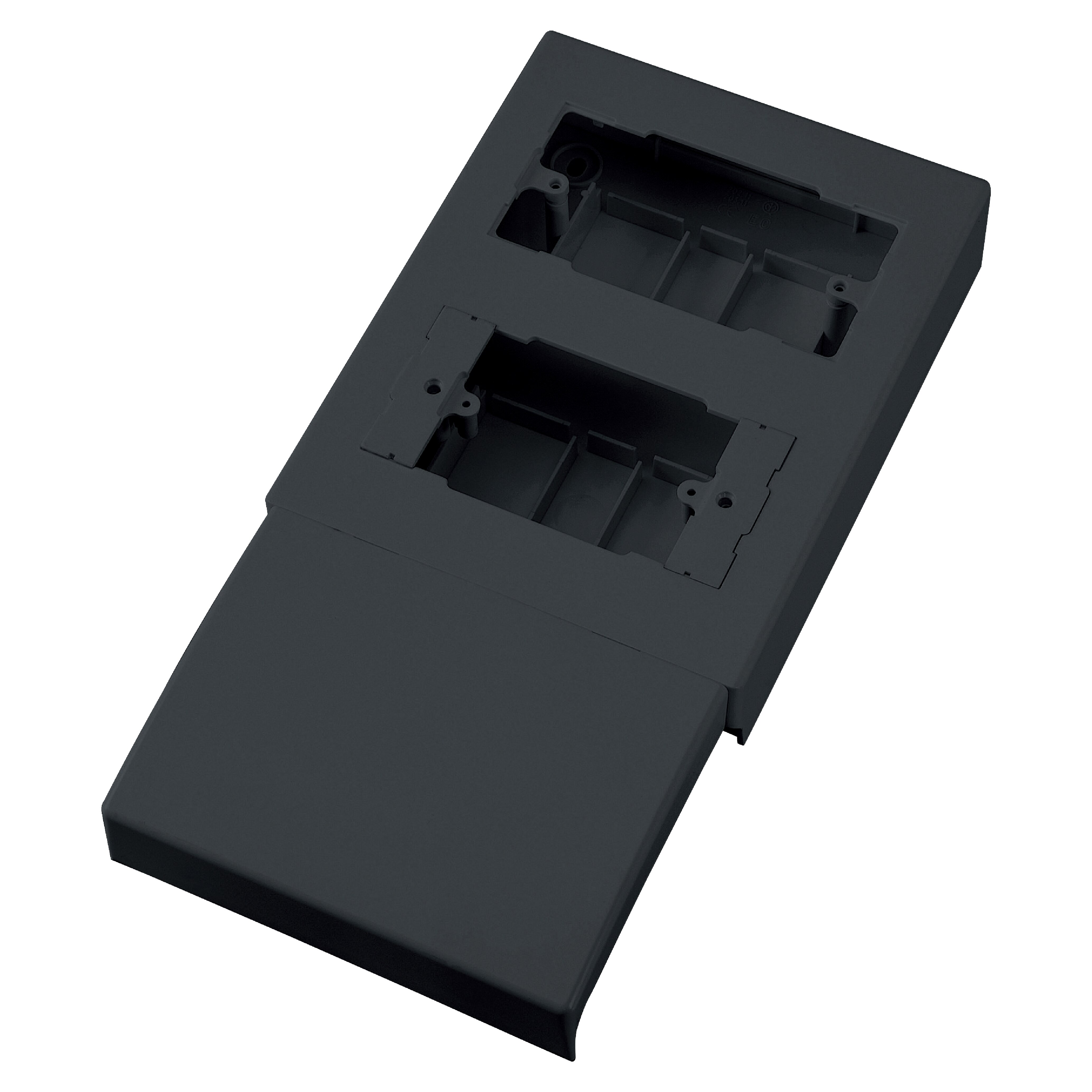 The 4+4 module 108.5 mm center-to-center appliance box can be used to install up to 8 Italian standard appliances or 4 multi-standard sockets. A row, with the supplied accessories, can be reduced to 3 modules. The large internal volume allows for the installation of any appliance. The box is composed of three assembled parts: the lower part, which snaps onto the trunking and the wall with 4 screws, and serves as an insulating base and a grid separating the various circuits. The upper part is appropriately shaped to accommodate the appliance fixing frames. The trunking cover, in addition to its protective function, gives the whole a harmonious and elegant shape.