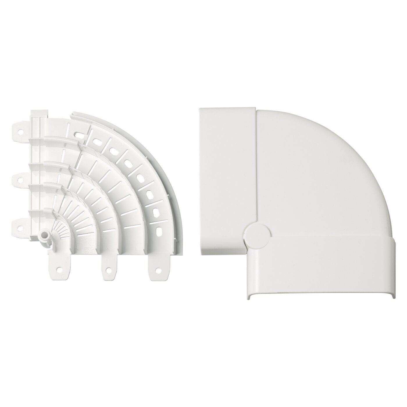 A flat angle that connects two straight sections of duct on the same plane, with an intersection angle ranging from 90° to 170°. It consists of a lower section that can be cut to the required angle, secured to the duct with screws, and a modular upper cover that overlaps the duct. The micro-hooks that secure the duct ensure a tight seal even in the event of significant impacts.