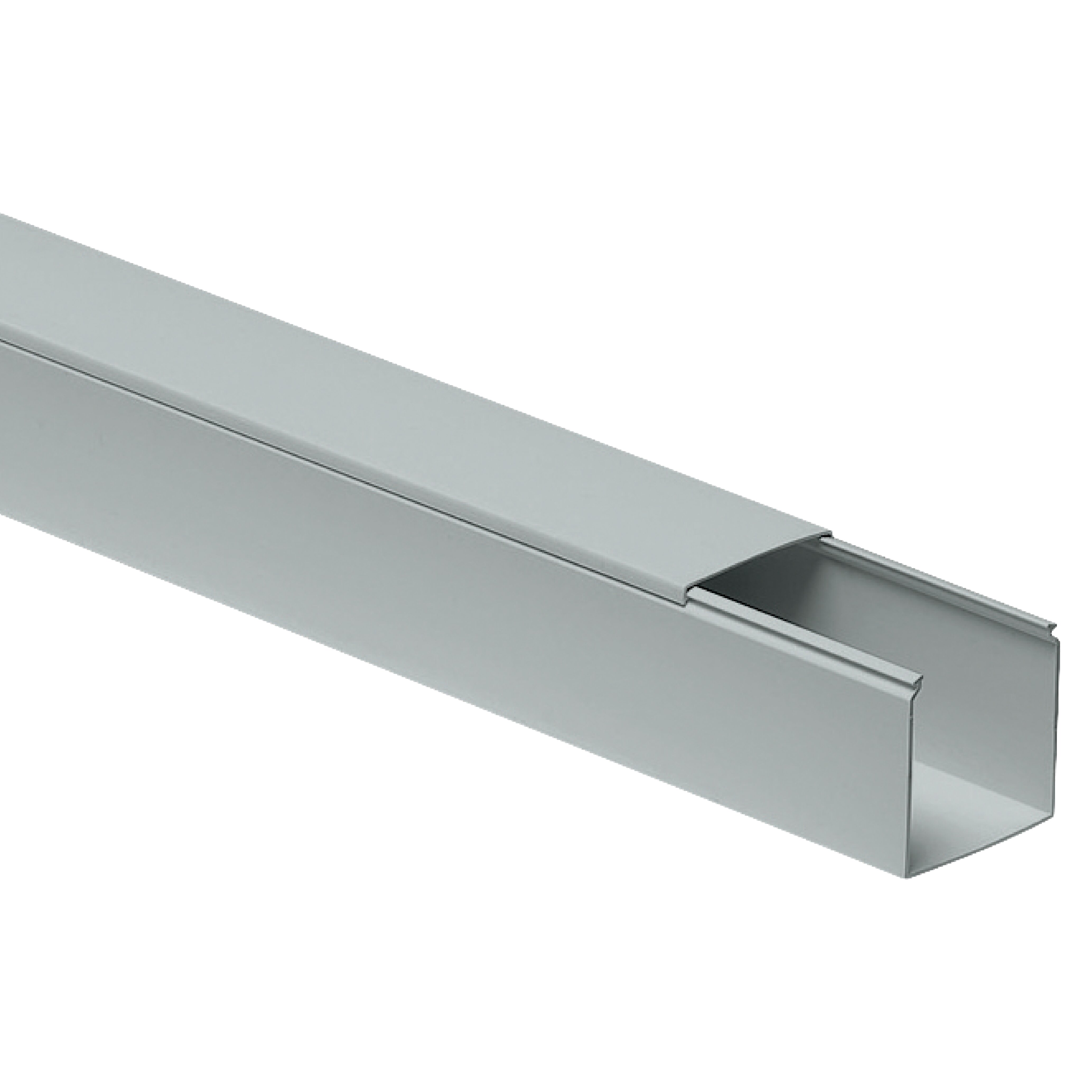 Cable duct made of self-extinguishing rigid PVC technopolymer. The bottom is pre-drilled for fixing with screws and anchors. A front-hinged lid is included.