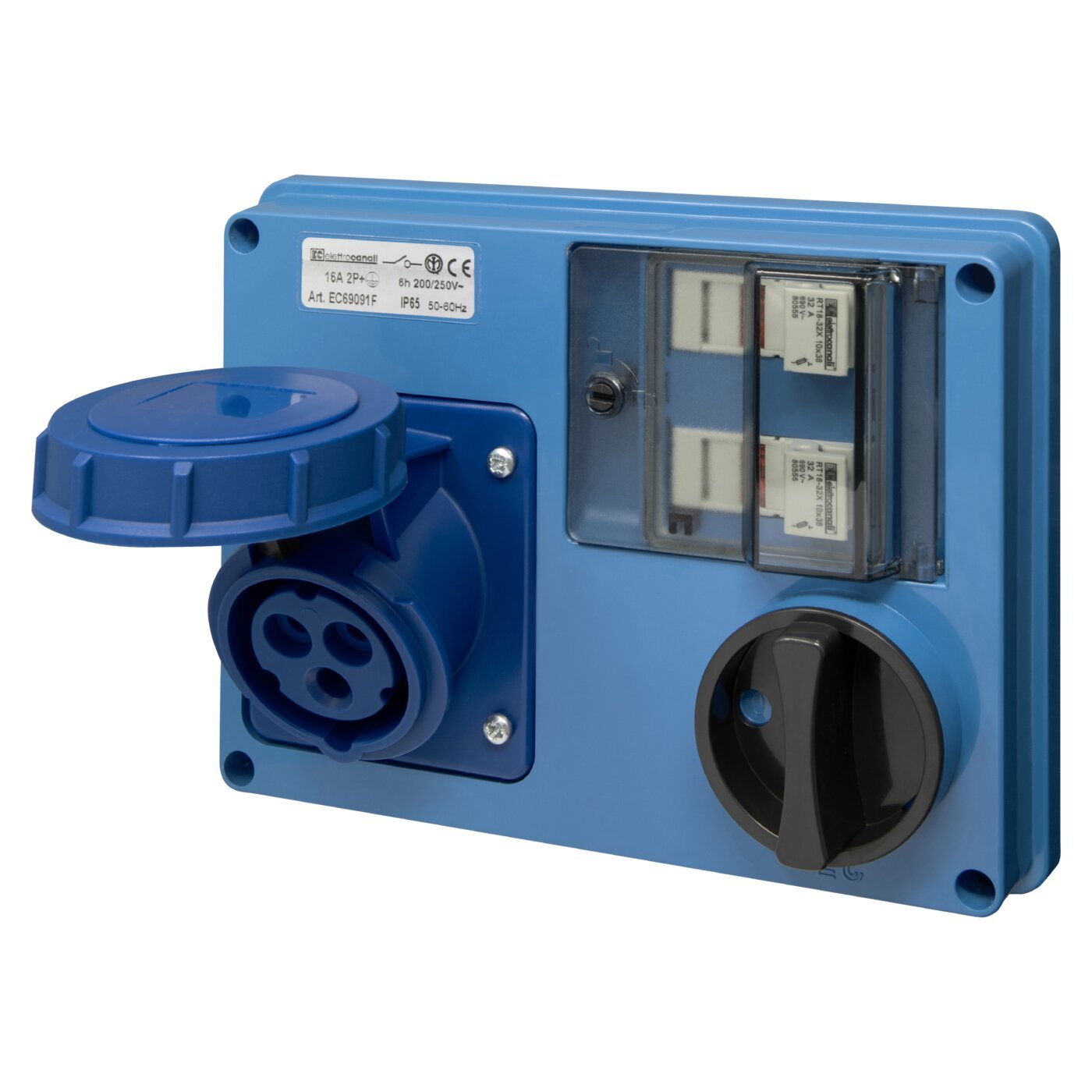 PANEL-MOUNT HORIZ. INTERLOCKED SOCKET WITH FUSE HOLDER IP65 220V 2P+E 16A